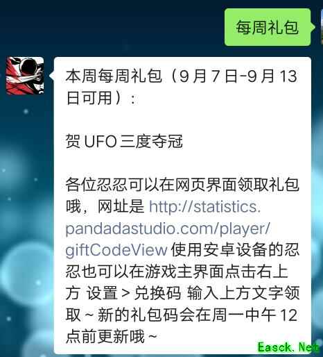 《忍者必须死3》9月7日礼包兑换码领取兑换码:贺UFO三度夺冠 领取时间:9月13日前 这是一个周礼包,大家可以在公众号中输入【每周礼包】领取。