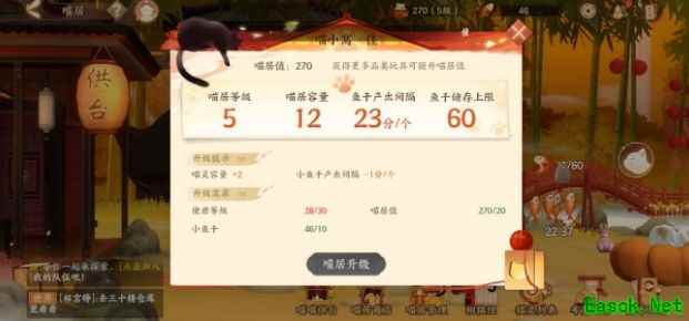 《忘川风华录》喵居升级攻略点击【喵居管理】界面即可了解当前喵居等级、可容纳猫咪上限、生产小鱼干速度等喵居详情,喵居的等级决定着可容纳猫咪数量的上限,因此想要吸引更多的猫咪入住,喵居升级一定不能少,想要升级喵局则需要满足相应的要求,要求较为多样,小编推荐解决要求顺序为喵居值,小鱼干数量,等级、喵灵挑战、其他。
