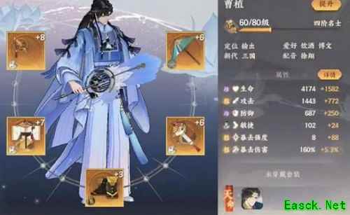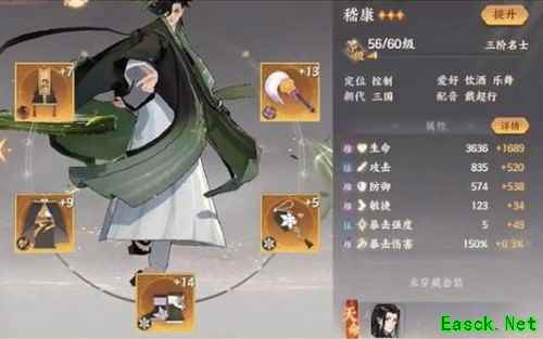 和曹植有相似之处,但魏征的觉醒伤害倍率可观,且六星魏征拥有天卡级别的输出,在天卡星级不强的情况下可作为主C培养。 适配套装:正音(每次攻击增伤增防)、踏破(简单的加强伤害)、文曲(真元加攻穿甲,每回合多次出手普攻,攻击加强效果明显,觉醒倍率高,配合文曲效果可以秒人)、姑射(吸血,多次出手可保持健康血线打持久战)。 三、嵇康: