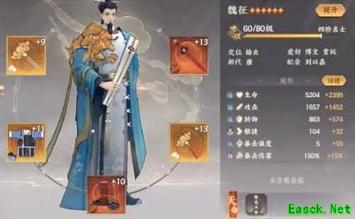 灵器:适配的套装非常多,推荐使用正音(每次攻击增伤增防)、文曲(真元加攻穿甲,因为曹植不需要使用觉醒,真元叠加后一直存在,且每回合多次出手普攻,攻击加强效果明显)、踏破(简单的加强伤害)、姑射(吸血,多次出手可保持健康血线打持久战)、驭衡(普攻带眩晕,多次出手点控效率大大提升,可做功能卡使用)。 武器、饰品、鞋子属性:攻击、攻击加成、暴击强度、敏捷 防具属性:优先效果抵抗!曹植若被控一回合,损失的输出和七步叠加非常亏。 二、魏征: