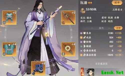 这个角色整体看起来伤害偏低,协战触发概率也不甚理想,但触发一次就会影响战局。个人建议红拂女当成辅助来玩。 推荐套装:流光(受击冰冻敌人,拖时间)、德盛(受击减元,拖慢快攻型阵容节奏)、市隐(保持阵容人数,提高协战次数)、捭阖(净化队友,提高阵容稳定性)。 五、阮籍:
