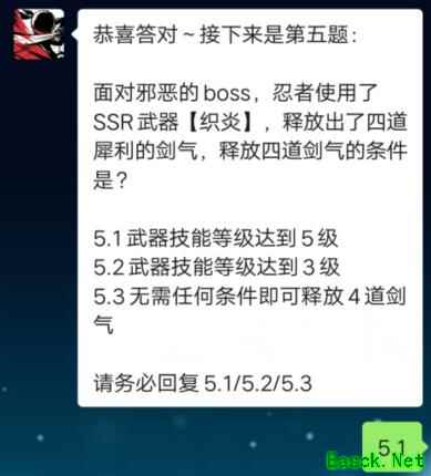 《忍者必须死3》2021年3月月考考试答案题目:面对邪恶的boss,忍者使用了SSR武器[织炎] ,释放出了四道犀利的剑气,释放四道剑气的条件是 答案:5.1 武器技能等级达到5级