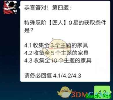 《忍者必须死3》2021年3月月考考试答案题目:特殊忍阶【匠人】 0星的获取条件是 答案:4.2 收集全5个主题的家具