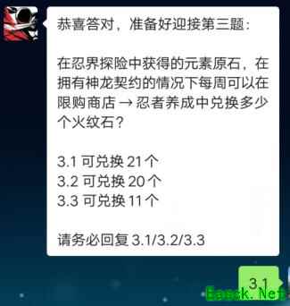 《忍者必须死3》2021年3月月考考试答案题目:在忍界探险中获得的元素原石,在拥有神龙契约的情况下每周可以在限购商店忍者养成中兑换多少个火纹石? 答案:3.1