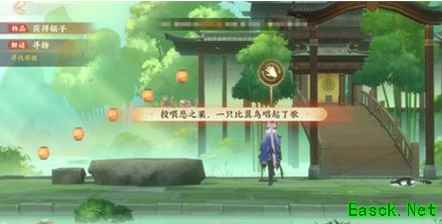 5、然后走到竹林中鸟笼的位置,进行投喂,提示一只比翼鸟唱起了歌。