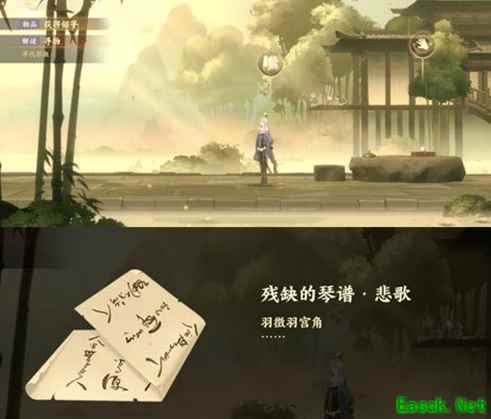 2、向左边走到如图位置就能获得---残缺的琴谱·悲歌。