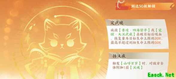《忘川风华录》刘彻喵技能介绍定武魂:施放【普攻.四海皆平】或【觉醒.大汉武威】击败目标后吸血,恢复量为目标生命上限20%,最高不超过刘彻生命上限的50% 扬汉威:触发【山呼万岁】时,对敌方全体附加1层【汉魂】