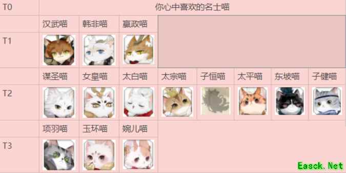 《忘川风华录》名士猫排行介绍T0:你喜欢的名士猫 T1:汉武喵、嬴政喵、韩非喵 T2:谋圣喵、女皇喵、太白喵、太宗喵、子恒喵、太平喵、东坡喵、子健喵 T3:项羽喵、玉环喵、婉儿喵