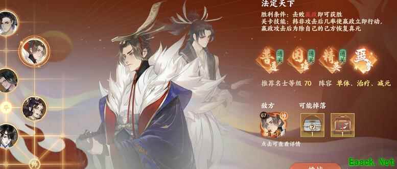首先着重讲一下法定天下·噩梦这一关,首先说一下在不借助高练度角色下的翻车点。 对面的角色等级全部为67级,其实就还好推荐等级为70级,首领为嬴政(将),韩非(士),嵇康(车),王昭君(马),卫青(马)。首先跟大家解释 一下为什么先讲法定天下,因为这是这三周以来,群里公认最恶心的联动轴承本,没有之一啊,因为韩非和嬴政的联动是AOE攻击。韩非作为士,有着当帅受到攻击时,士会反击技能释放单位(也就是100%反击)然后因为现在的队伍,都是单C队伍且大家主养的都是嬴政和李世民。我只能说高练度的嬴政和韩非,双C碾压一下都过去了,但是这个本,简直是单C噩梦。我全员60复活套四保一完全行不同,但凡我当初没洗我大秀宁,我怀疑我这周也单过了。四保一时真的难打这个本。后手有王昭君的减速和嵇康的睡眠关键位置,速度调不好就会导致乱速,或者李清照和袁天罡被控制,也就是根本啥都没干就连死两次。我对这个本的意见就是,有李世民的赌自己暴击加另外一个输出秒掉韩非,即可正常通关。 还是用老阵容主C+大周后+李清照+袁天罡+助战。