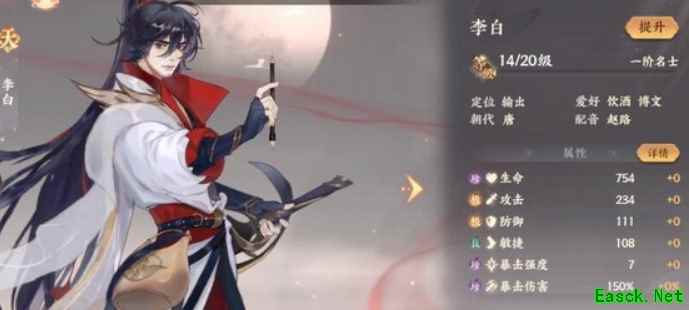 一技能为”四海皆平“,可以对敌人打出百分之一百一十的伤害效果,同时还可以附加一层”汉魂"效果,能够降低百分之五的暴击抵抗。 被动技能为“山呼万岁”,在击倒指定目标后,可以对全体的敌人打出百分之四十的攻击伤害。 觉醒技能“大汉威威”,可以打出强劲的高伤,最高打出百分之三百二十的伤害,并能够获得是敌方陷入“虚弱”的效果。 2.李白