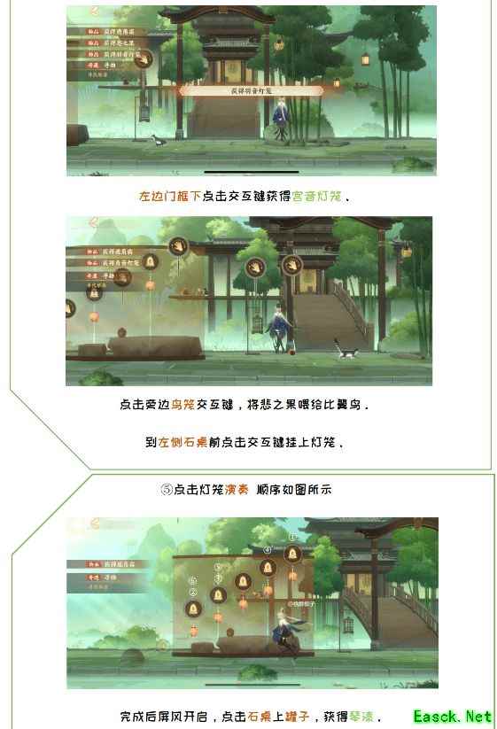 右走找到四个玩具,选择如下所示的 往前走,点击在在玩具前的狸花猫 选择下图玩具 四处走走会看到游荡的奶牛猫,点击 带它选择最右边的玩具 左走在地图最左端会找到橘猫 选最左面的玩具 清除喵灵身上的恶灵之气-规律是点击该喵灵会改变它和它周围喵灵的状态,初始是布偶和奶牛冒黑气 依次点击:橘猫-狸花-布偶殴打魇化鲶唢呐-打开灵瞳猫眼-完 2、忘川风华录和鸣之琴奇遇攻略 ①探查香炉,在幻境,在钓鱼的猫猫正下方,有一个看起来像炉盖的东西,探查完毕会获得鹿角霜。 ②穿梭进入忘川,打开桌上第一个盒子,密码五四五一三,获得悲之果。在盒子前方有一个泛红光的灯笼,拿到角音灯笼。 ③喂给鸟悲之果,它会唱第一.首歌。然后将角音灯笼挂在中间。在鸟旁边有一个泛红的,是宫音灯笼,把它挂在最下面。竹林里有第三个灯笼,羽音灯笼,挂在最上面。 ④顺序:从左到右:12345,5-1-2-4-2-1。在最左边灯笼处获得竹刀,中间泛红的罐子用来加鹿角霜,得到琴漆。进入幻境,把琴漆交给嵇康,他会让你去找琴徽。