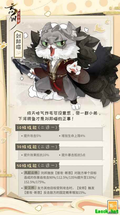 《忘川风华录》刘邦喵技能属性介绍【技能属性】 成天哈气炸毛可没意思,带上一群小弟,下河捞鱼才是本喵应该做的正事!