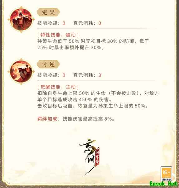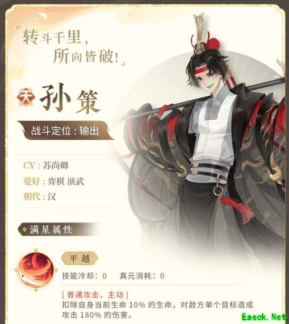 《忘川风华录》孙策技能属性介绍【技能属性】 “我生在乱世,就是为了当英雄的!”