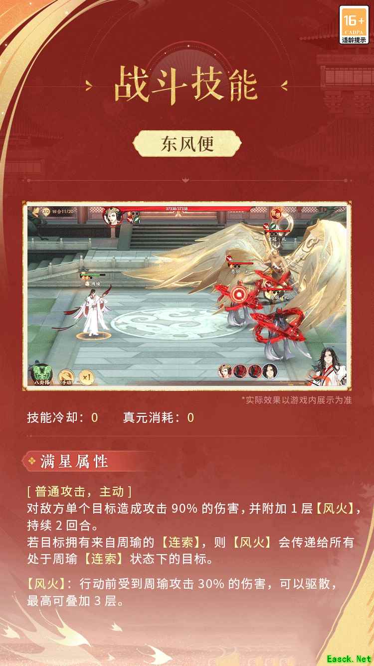 《忘川风华录》周瑜满星技能介绍1、普通技能--东风便(普攻)--对1名敌方造成90%伤害,并附加1层(风火),持续两回和。若目标拥有(连锁),则(风火)会传递至所有处于周瑜(连锁)状态下的目标。 风火:行动前受到周瑜攻击30%的伤害,可叠加至三层,可驱散。 评价:伤害低,但是(风火)的效果使得实际的第一次攻击达到了120%,最高可以达到180%,但是需要注意的是可以驱散,也即是会被捭阖,杜甫,卫子夫等驱散Debuff,由于杜甫,卫子夫,捭阖等在金戈出场的次数越来越多,这个普攻其实偏弱。