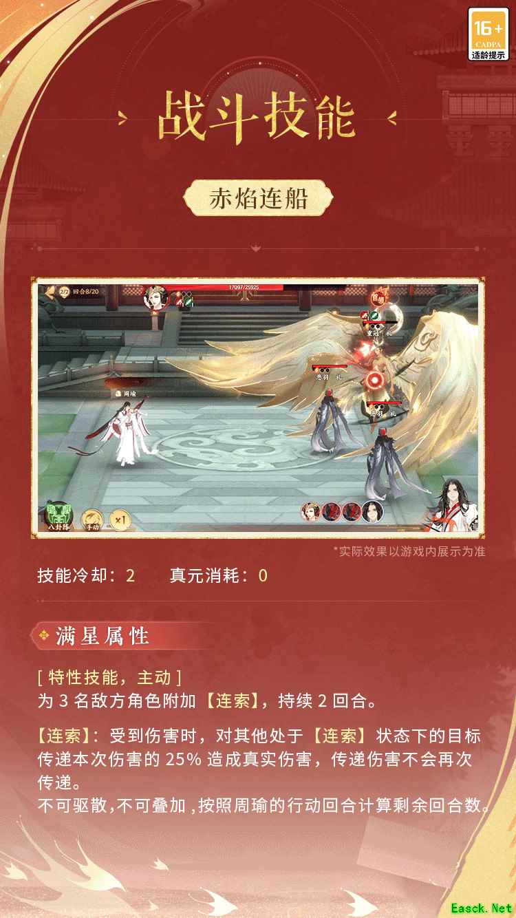 2、特殊技能--赤焰连船(主动,冷却2回合。)--为三名敌方名士附加(连锁),持续两回合。 连锁:收到伤害时,对其他处于(连锁)状态下的目标传递本次伤害的25%真实伤害,传递伤害不会再次传递。不可驱散,不可叠加,按照周瑜的行动回合计算剩余回合。 评价:个人认为是周瑜的核心技能,对目标(连锁)后,群体输出造成的伤害会变为原本的1.5倍。政非普攻灭队好像又要来了?