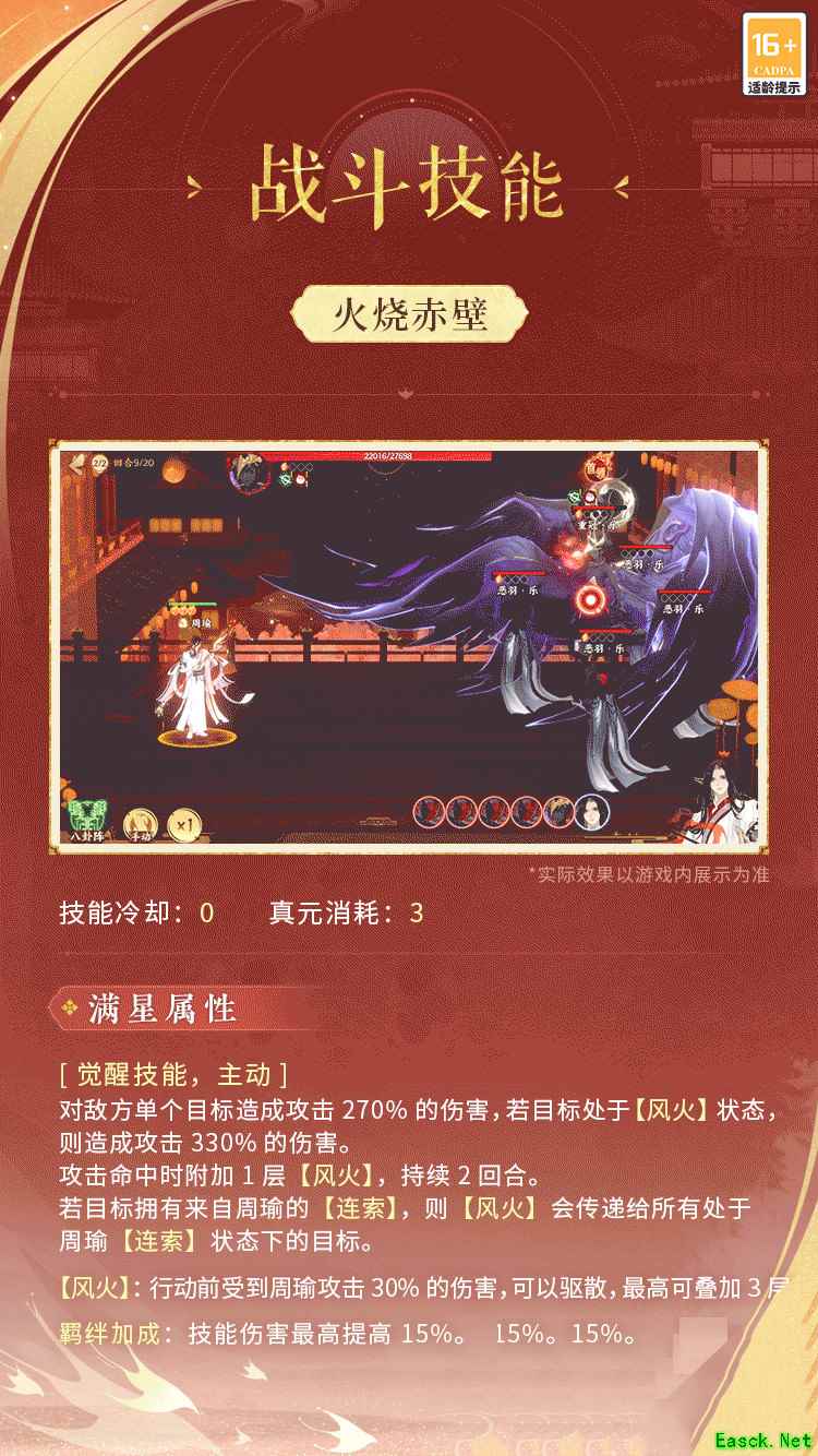 3、觉醒技能(3火)--火烧赤壁(3火觉醒)--对敌方单体目标造成270%的伤害,若目标处于(风火)状态,则造成330%的伤害。攻击命中时附加1层(风火),持续2回合。 若目标拥有(连锁),则(风火)会传递至所有处于周瑜(连锁)状态下的目标。 评价:中规中矩的单体输出觉醒。