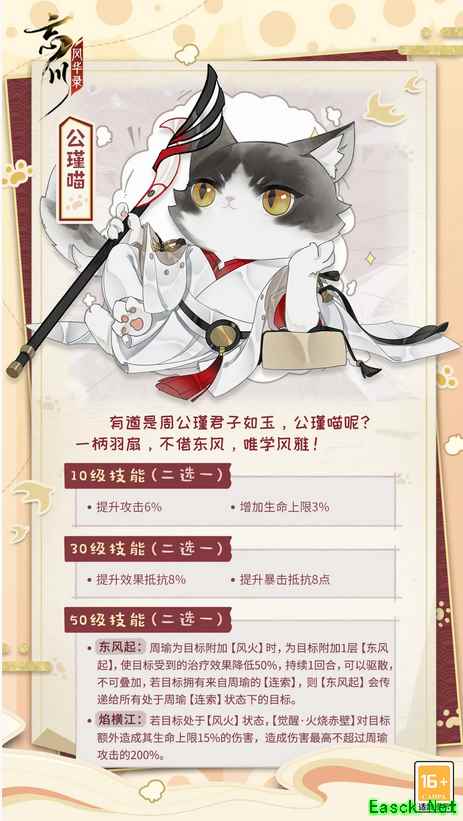 《忘川风华录》公瑾喵技能属性介绍【技能属性】 有道是周公瑾君子如玉,本喵呢? 一柄羽扇,不借东风,唯学风雅。