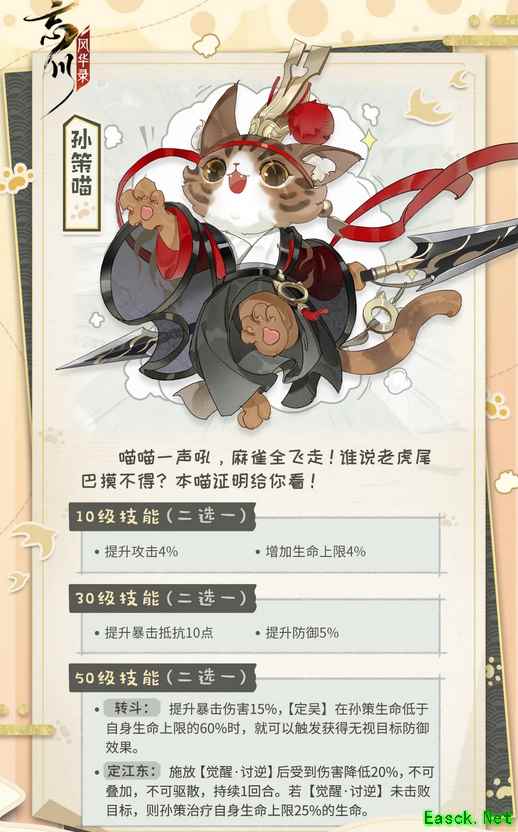 《忘川风华录》孙策喵技能属性介绍【技能属性】 喵喵一声吼,麻雀全飞走。谁说老虎尾巴摸不得?本喵证明给你看。