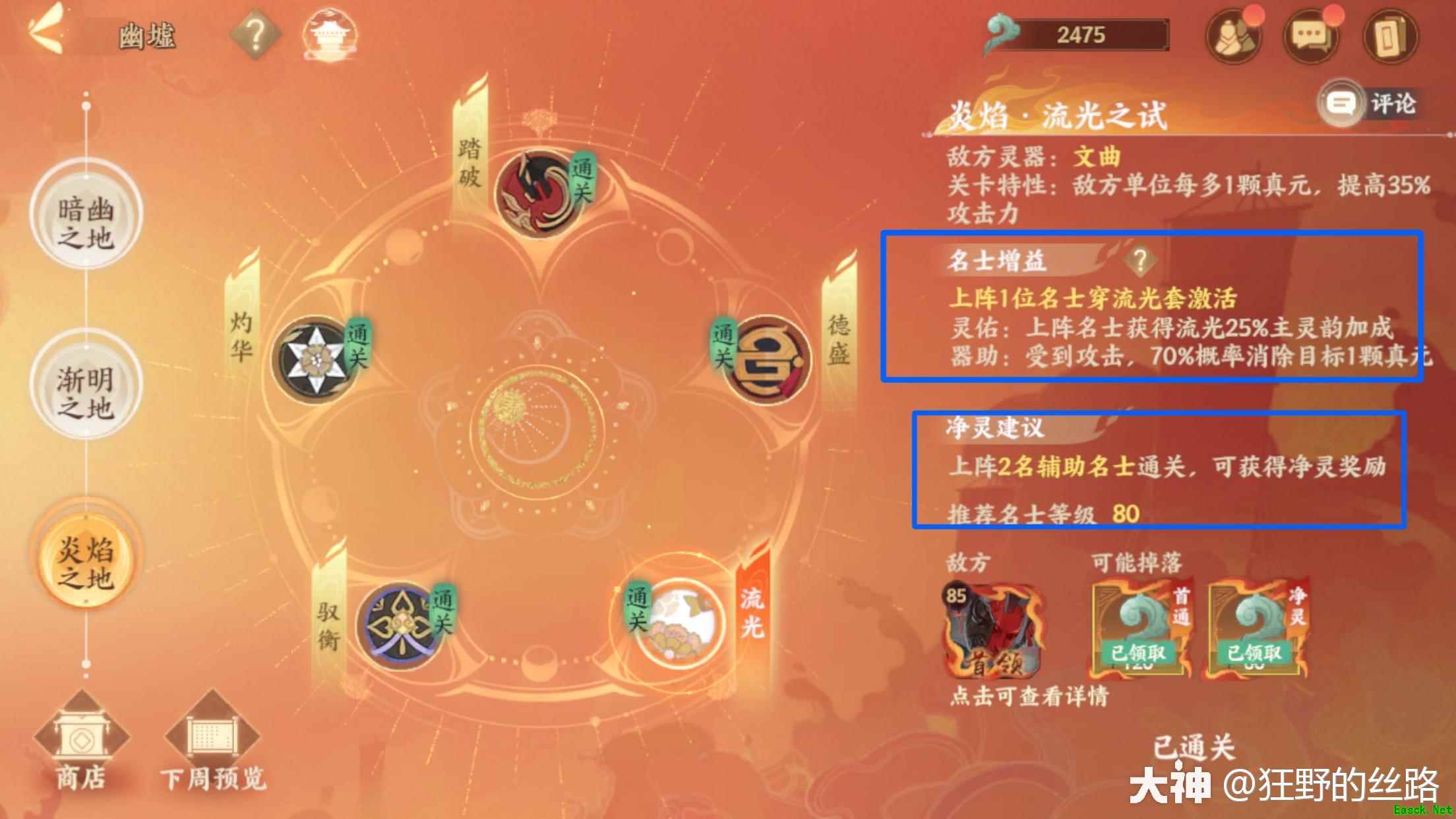 副本详情 1、从暗幽之地-炎焰之地总共3个难度(以开服半年来说,这些难度相对都比较简单) 2、每个难度有5个副本(练度不够的小伙伴,可参考名士增益佩戴灵器) 3、每个副本有对应的灵器佩戴增益(练度高的大佬可直接忽视,硬钢就好) 4、本周净灵额外奖励是上阵2名辅助名士(这里想拿到全部奖励,就一定要按建议来) 5、尾速177即可超速大部分副本(部分副本未能超速,不过没影响,速度下限未测) 6、每次通关副本后,可获得一定数量的【良品胚】 7、没拿完全部奖励的,可一直攻打,无消耗 以上就是《忘川风华录》幽墟副本玩法介绍的全部内容了,更多手游攻略请关注手游网! 本文内容来源于互联网,如有侵权请联系删除。 |