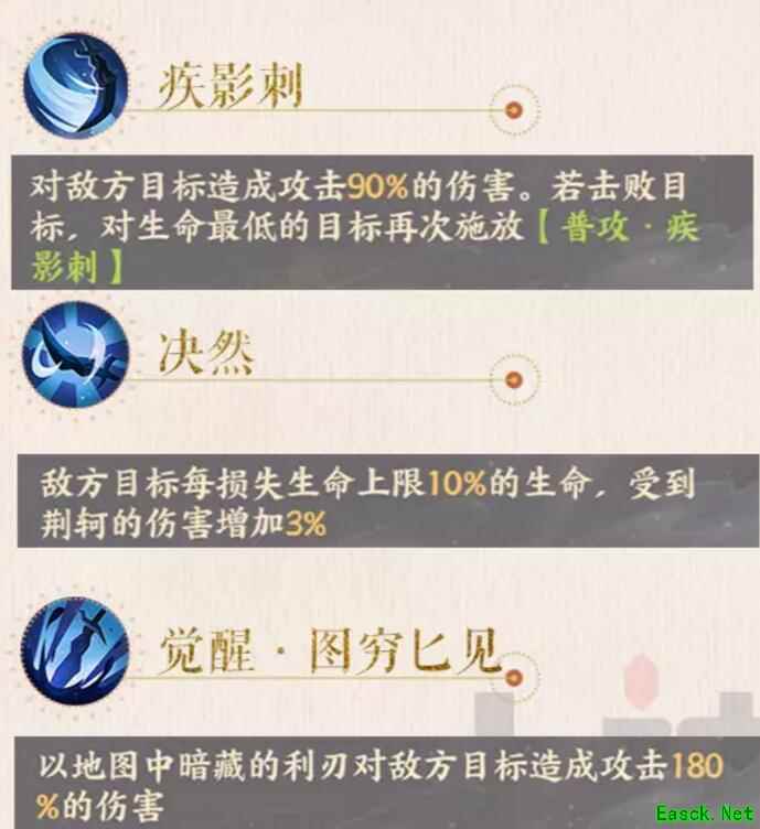 《忘川风华录》荆轲天命效果技能阵容搭配一览【基础属性】 强度评级: T0 觉醒消耗真元: 3 优质属性:攻击、暴击伤害、暴击 特殊机制:击败补刀 推荐团队位:单体输出 天命组合技: 1、蠃政,天命技能[刺秦]。荆轲的暴击伤害提升40%。 2、高渐离,天命技能[易水决],荆轲[觉醒.图穷匕见]无视敌方目标10%的防御。 【技能介绍】 疾影刺、决然、觉醒·图穷匕见