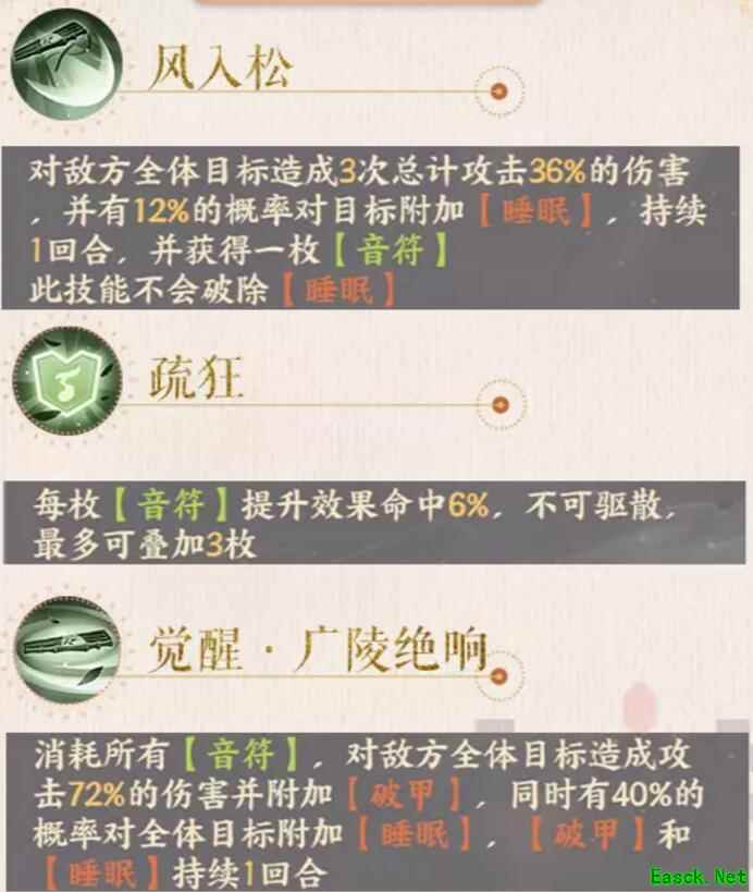 《忘川风华录》嵇康天命效果技能阵容搭配一览【基础属性】 强度评级: T2 觉醒消耗真元: 4 优质属性:暴击伤害、生命、防御、敏捷 特殊机制:睡眠 推荐团队位:群体控制 天命组合技: 阮籍,嵇康每[睡眠]1名敌方角色,阮籍添加一枚音符。 【技能介绍】 风入松、疏狂、觉醒·广陵绝响