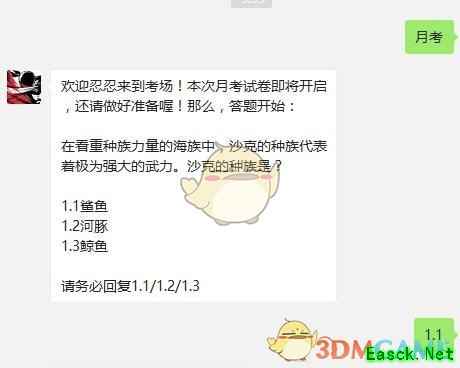忍者必须死3七月月考答案2022题目一: 在看重种族力量的海族中,沙克的种族代表着极为强大的武力。沙克的种族是? 1.1鲨鱼 1.2河豚 1.3鲸鱼 请务必回复1.1/1.2/1.3 1.1
