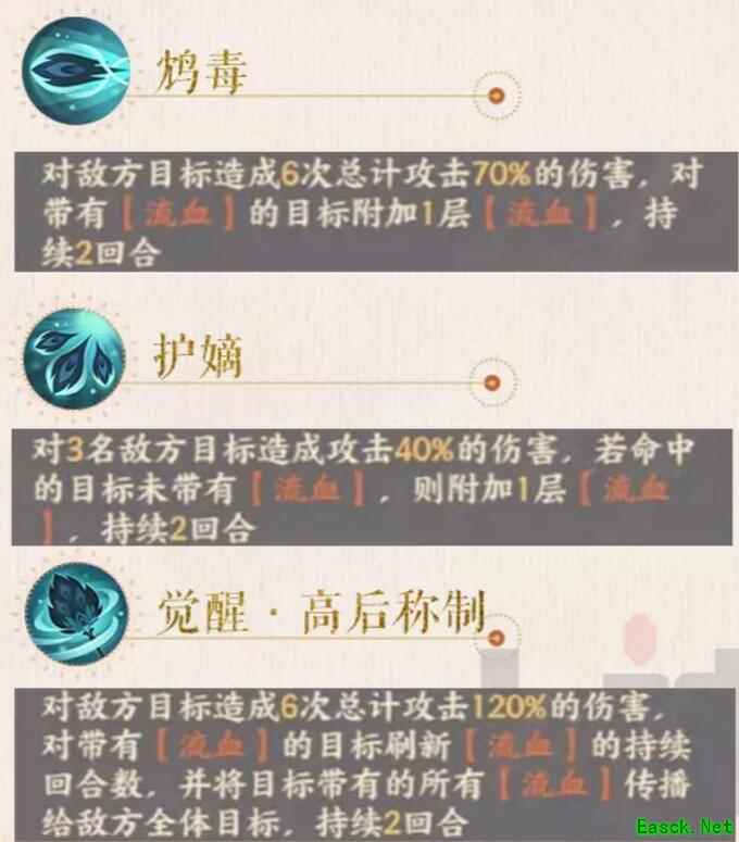 《忘川风华录》吕雉天命效果技能阵容搭配一览【基础属性】 强度评级: T2 觉醒消耗真元: 3 优质属性:生命、防御 特殊机制:流血、溅射 推荐团队位:辅助 天命组合技: 刘邦,吕雉普攻附加流血时有I25%概率额外附加一层流血。 【技能介绍】 鸩毒、护嫡、觉醒·高后称制