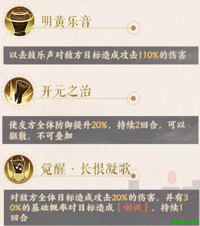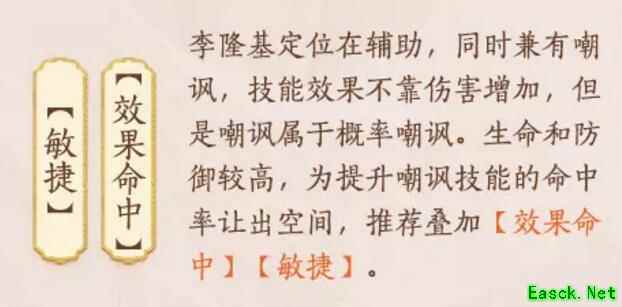 《忘川风华录》李隆基天命效果技能阵容搭配一览【基础属性】 强度评级: T2 觉醒消耗真元: 2 优质属性:生命、防御 特殊机制:嘲讽 推荐团队位:辅助 天命组合技: 杨玉环,李隆基攻击时最高降低目标攻击10%。 高渐离,李隆基特性技能使目标获得最高10%效果抵抗。 【技能介绍】 明黄乐音、开元之治、觉醒·长恨凝歌
