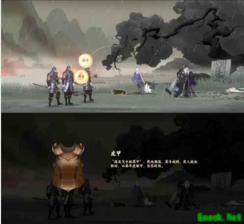 3、皮甲:第三图,往右划过大石头,在三个士兵的旁边。