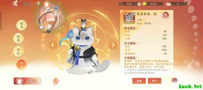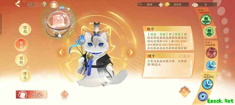 猫属性五敏捷,猫技能2/2/2。 推荐搭配高爆发启动快的阵容(代表性阵容梁花/墨班/嬴政等),屈原p2先手开大可以限制对方的觉醒技能释放,极大减少了敌方输出。并且给己方增伤,提升获胜概率。
