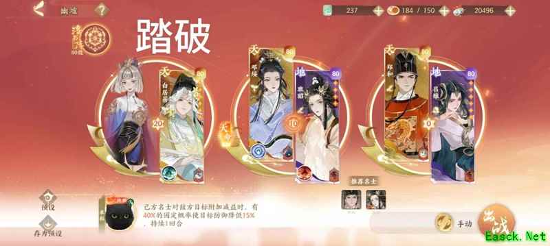 ·踏破 我觉得是最难凹的一关。低练度通关要碰碰运气,先集火物华怪,第5回合没打死物华怪就可以重开了 流血队用洛书阵,名士星级低所以对应的灵器要求比较高,可以从主队身上扒,对面觉醒伤害高需要治疗量高的名士,治疗不能太脆,尽量不要让名士退场