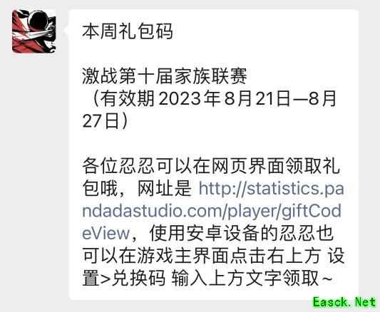 礼包码领取方法地址:1、网页领取地址是:http://statistics.pandadastudio.com/player/giftCodeView (苹果用户只能网页领取!) 2、使用安卓设备的忍忍领到地址: 游戏主界面点击右上方设置>兑换码输入兑换码文字领取,点击填写后需要在邮箱内提取!