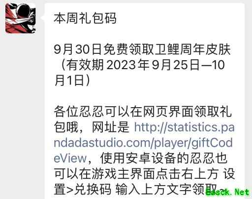 《忍者必须死3》9月26日兑换码领取2023今日兑换码:9月30日免费领取卫鲤周年皮肤 有效期到:2023年10月1日