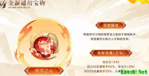忍者必须死3修罗之心属性怎么样,将能焚尽万物的修罗业火收驻于琉璃珠中,攻击力+334;BOSS血量低于50%,忍者对其攻击力+280;BOSS血量低于25%,忍者对其火属性攻击+360。*修罗之心不可与赤晶魂印共同装备,效果详情见游戏内宝物描述。