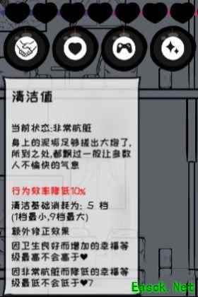 四、左数第四个「清洁值」【菱形图标、星星】 最高可降低行动效率10% 恢复方法:洗手、洗澡 附加负面buff:邋遢[尿床事件][第一个选项][洁净时幸福值---]
