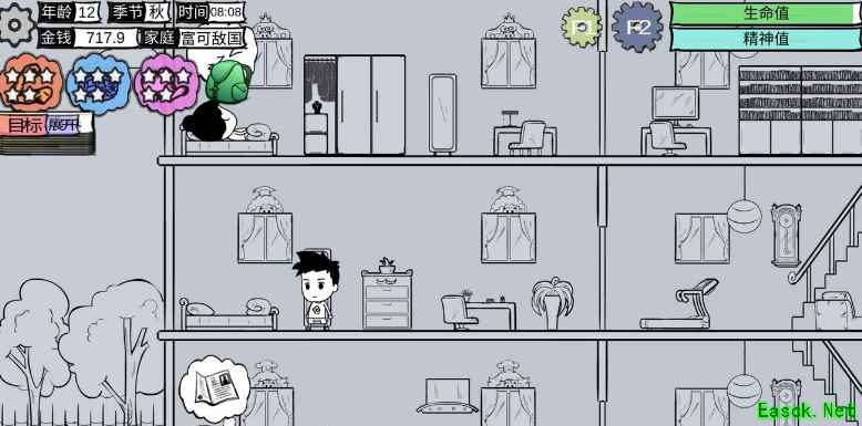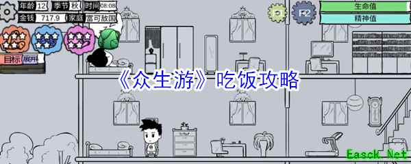 《众生游》吃饭攻略1、到时间去餐桌吃饭,看好时间,一般是七点十二点和十八点,坐在那边会有吃饭看书玩玩具什么的按钮冒出来,如果没有吃饭按钮可能是没饭吃了。 2、在中午11:55就蹲在餐桌那里,如果看到妈妈在那里煮饭的话,那么你等一下就可以吃饭了。