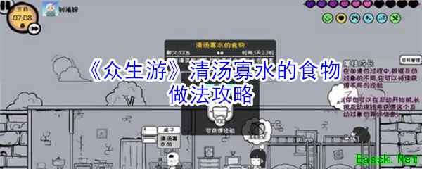 《众生游》清汤寡水的食物做法攻略清汤寡水的食物 二星 耐久:100% 时间:1天23时 简单清淡的米汤,也许更适合修行中的出家人。 1星加烹饪理论经验速度95。这个同上,营养不良的速度没那么快。