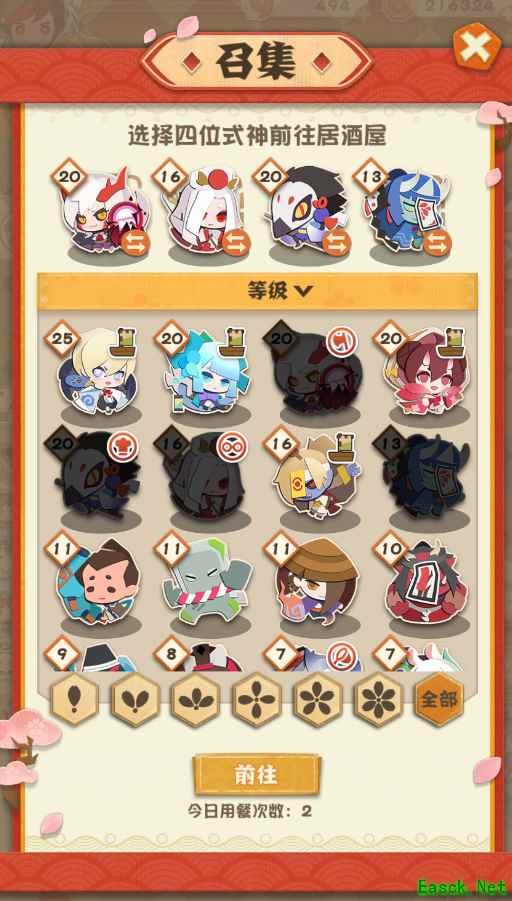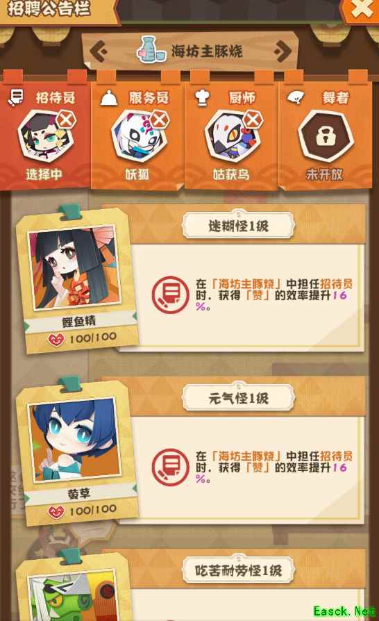 玩家们通过升级居酒屋,可以解锁服务员、厨师和舞者三个职位,加上本身就有招待员,这些职位都会为你获得“赞”,赞是配用于培养式神的重要资源,收集赞提升自己才是王道。 可以通过点击对应位置的纸人进行式神派遣,不同的式神在对应职位会有额外的效果,快让你的崽打工吧。