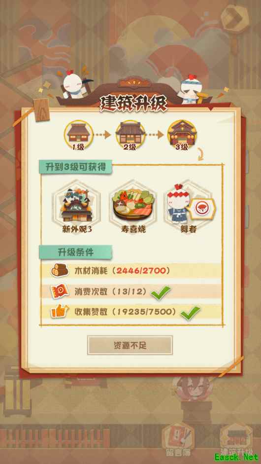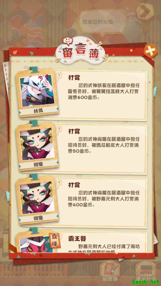点击查看留言簿后,能看到其他人的打赏与点评,这些点评可以领取金币奖励。 而在建筑升级界面能够升级你的居酒屋,通过等级提升,居酒屋会改变外观,解锁新的食物,增加新的职位。