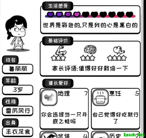 4、关于出身: 目前游戏主要有贫穷,小康,富贵3种出身,这里面还有细分,在此不赘述, 明确一下,出身越好,先天优势越大。出身好的家庭,基础设施也会更好,方便学习技能,增加基础属性。 而且也会影响父母给的零花钱数量,家境越好,父母给的零花钱也越多。(目前无法挣钱,主要靠父母给钱,不过大部分时间父母给不给你,还是看运气的。) 5、关于生活感受: 主要涉及幸福值,如上图所示,一共10档,幸福度不同,孩子对生活的感受也不同。 增加幸福值主要靠长时间维持其他需求来满足。 (幸福值下面的其他需求,从左到右,依次是社交值→心情值→娱乐值→清洁值→睡眠值→饱食度) 这些基本的需求是否得到满足会影响人物的行为效率,即学习技能的速度快慢。 6、关于基础评价: 基础评价会随着孩子年龄的变化而变化,每个年龄段的评价标准都不同。 基础评价我们简单区分为体力,智力,魅力。 如上图所示,看主要差异,4岁时智力4星,5岁时智力3星。 基础评价只是当前年龄段的一个参考,只是告诉你,现在阶段你的孩子落后了,变得平凡了,不过这只是暂时的,人生路长,孩子也不会永远平庸,她总会有所成长的,这就需要我们注意培养。 7、关于擅长爱好: 总共有4个不同的技能,包括2个当前孩子擅长的最高级的技能,还有两个孩子喜欢的随机技能(技能等级可能比较低)。 擅长爱好会改变的,不要局限于开局刷出的爱好。 开局刷出的爱好都是启蒙阶段(技能等级可能在0~11之间),技能等级都在初学乍练(技能等级在0~29之间)的层次。 孩子的擅长爱好(至少有两个爱好)在前期一段时间内会增加娱乐值。 以上是《众生游》人物报告玩法攻略的全部内容了,更多精彩攻略,尽在易采游戏网,不知道大家喜欢吗,记得点击收藏易采游戏网。 本文内容来源于互联网,如有侵权请联系删除。 |