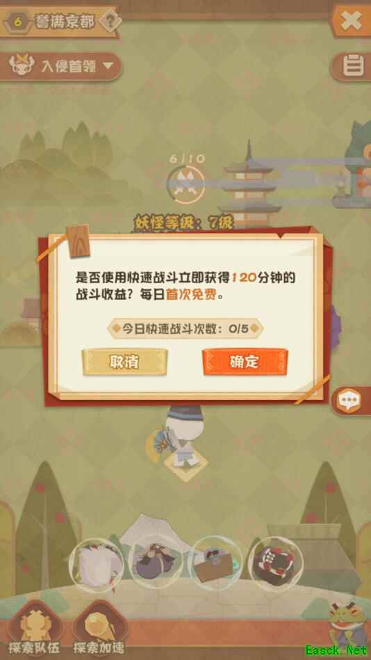 7、式神之间如果触发羁绊,会有额外的收益加成,比如酒吞童子和茨木童子在一起会达成“干了这杯酒”的羁绊,探索收益会享受4%额外加成。还有例如鬼使兄弟、桃花妖和樱花妖等等很多羁绊,各位家主可以慢慢探索。 8、完成编队后,点击开始探索就可以挂机了,下次上线后再回到探索界面,点击右下角的小青蛙收取挂机时间段内的收益。
