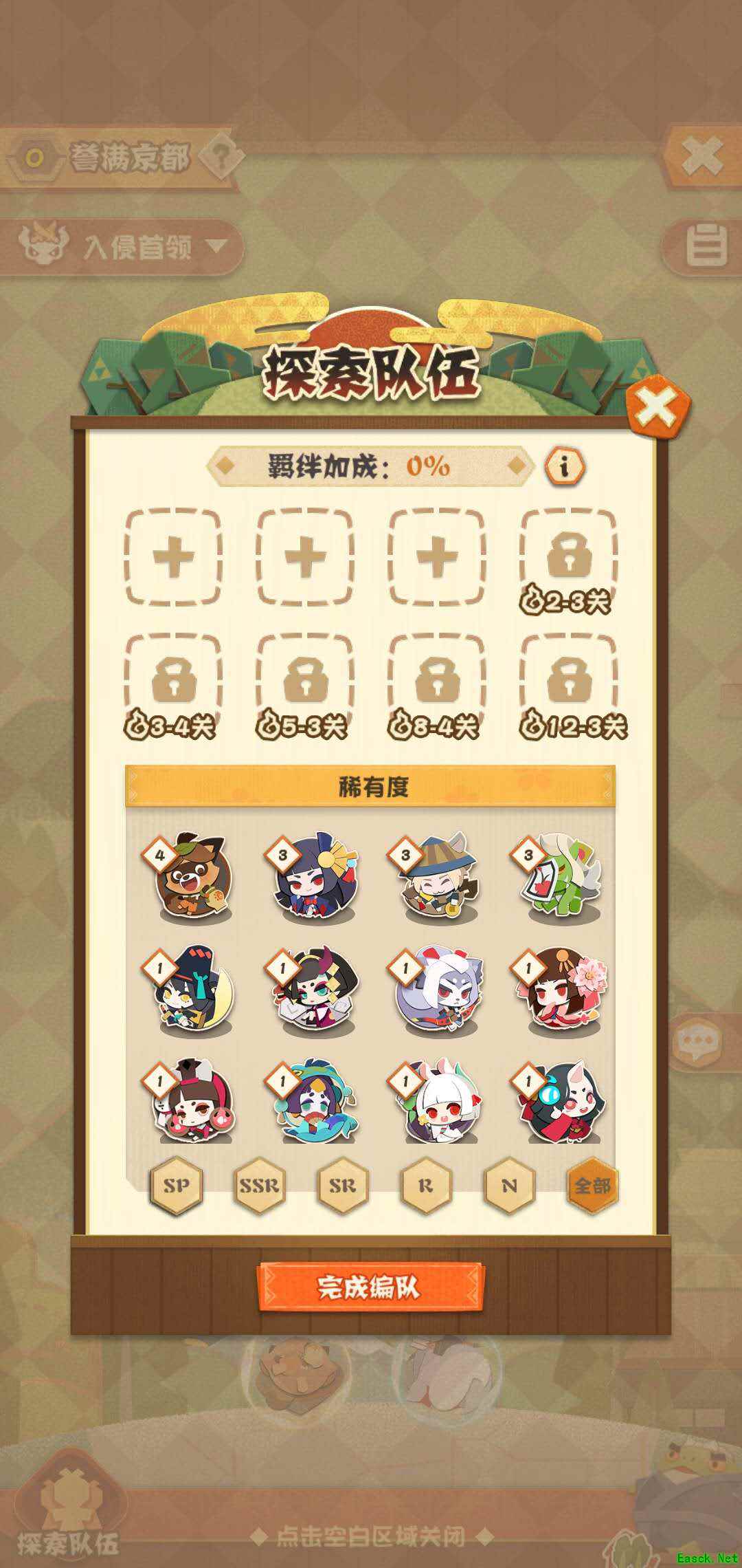 食材由式神挂机探索获取,点击庭院中的探索进入野外探索界面,在开始探索之前我们需要编排好探索阵容。探索队伍最多容纳8位式神,式神位置数量会随着通关关卡逐步解锁,通关12-3后全部解锁。