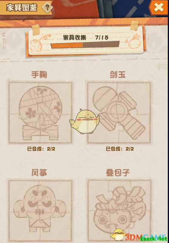 2、家具图鉴 玩家可以通过小鱼和金币兑换家具碎片合成家具,家具图鉴中可以看到家具收集进度,还可以看到已兑换和尚未合成的家具。