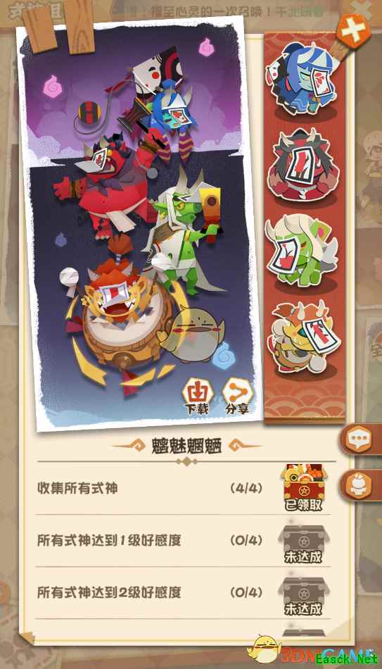3、小剧场图鉴 在式神满足一定条件的时候式神头上会出现感叹号,点击感叹号就可以触发式神对应的小剧场,在首次触发小剧场时,玩家可以获得奖励。玩家可以在图鉴中查看小剧场触发条件。 4、式神图鉴 顽疾可以查看已收集的式神绘卷,和妖怪百科。玩家可以查看式神立绘,简介、传记、语音和技能。