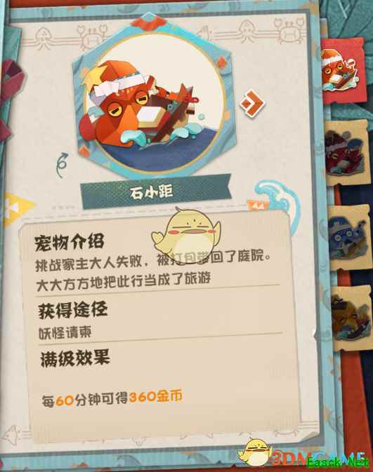 1、宠物图鉴 玩家在妖怪请柬中获得的宠物可以放在庭院中提供特殊效果,在图鉴里还可以看到宠物介绍,获取途径以及满级效果。
