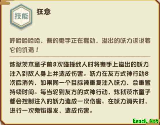 《阴阳师:妖怪屋》炼狱茨木童子技能介绍1、技能名称 狂意