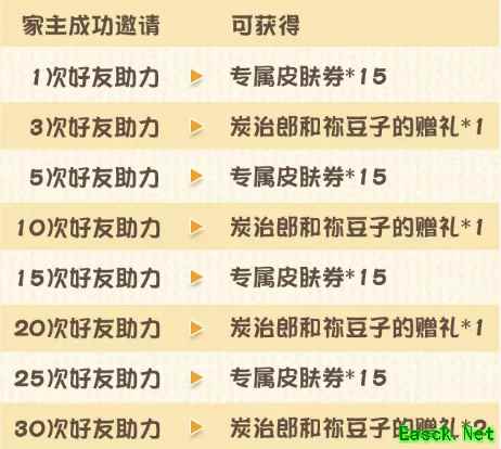 https://yysygw.163.com/2021/tqtwyd/ 三、规则 1、活动规则 1、玩家可以通过PC端或手机端链接,进入H5庭院界面,寻找到灶门兄妹; 2、玩家进入界面后,可点触灶门兄妹并根据提示给他们投喂食物提高饱腹值; 3、投喂结束后,玩家根据提示邀请好友一起来助力,继续投喂灶门兄妹。 2、助力规则 1、每个好友每天只能帮同一位玩家助力1次 2、每位玩家每天最多助力30个好友 3、每位玩家每天最多被助力20次 三、活动奖励