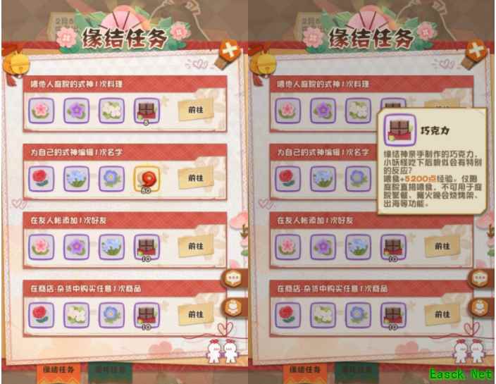 《阴阳师:妖怪屋》花语结缘活动攻略一、活动时间 2021年1月27日~2021年2月9日 二、缘结任务 缘结神在活动期间内会发布缘结任务,缘结任务每日刷新,仅限当日完成,完成缘结任务则可以获得花束与巧克力。