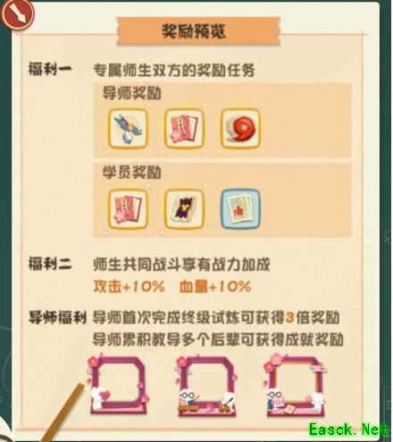 《阴阳师:妖怪屋》师徒系统介绍一、开放时间 报名时间:2月7日维护更新后—2月28日23:59 修学时间:报名成功后,毕业前均可自由修学 二、条件要求 导师要求:家主等级>35级 萌新要求:家主等级≤35级 三、活动规则 师生共同完成任务,赢取丰厚奖励。 完成全部课程内容后,【学员】便会解锁终极毕业试炼。成功通过试炼,就可以正式毕业啦~ 毕业后【导师】和【学员】都会收到毕业礼,辛勤授课的【导师】会受到额外的毕业礼奖励和成就奖励 四、奖励预览