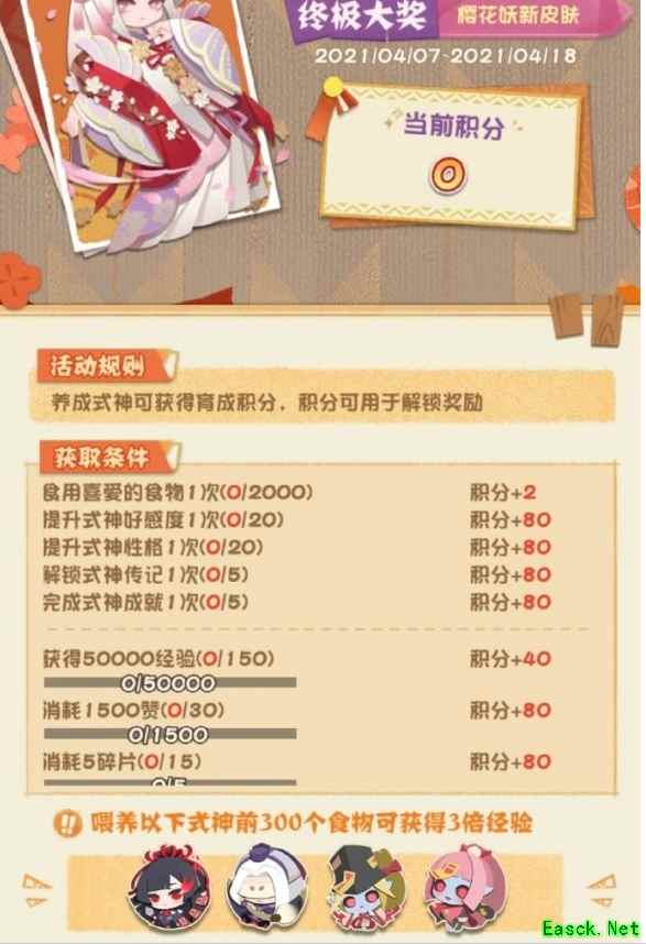 《阴阳师:妖怪屋》樱花妖皮肤早樱花见获得方法一、获取方式 通过活动【喂崽而战:花见】获得 二、活动介绍 ※活动时间:2021年4月7日维护后-2021年4月18日23:59 ※各位家主大人可选择活动推荐或自己喜爱的小妖怪培育,达成对应的培育目标获取育成积分。 ※积分累计到不同阶段可以解锁剪刀、勾玉、赞等多重好礼,达成最高阶段目标更可以领取终极大奖:樱花妖新皮肤「早樱花见」。 ※本期活动会选出四位推荐式神,喂养推荐式神的前300个食物可以获得3倍经验。 ※本期推荐式神:彼岸花、判官、跳跳弟弟、跳跳妹妹。